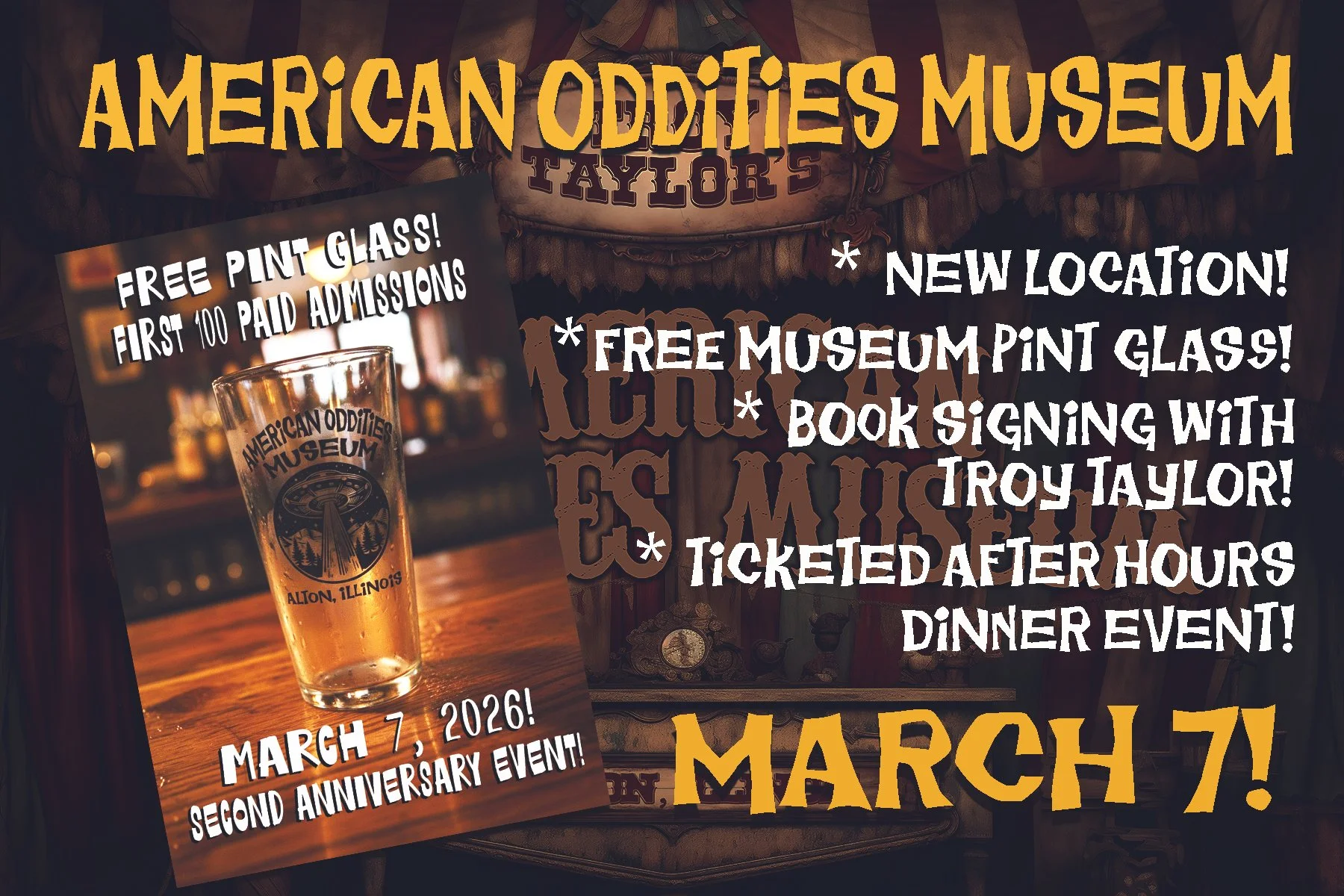 Join Troy Taylor at the American Oddities Museum in Alton, Illinois, for our second anniversary event! Spend the afternoon with us at the new location of the museum, check out new displays and exhibits, and get a FREE American Oddities Museum pub glass for the first 100 paid admissions of the day! Plus, stick around that night for our ticketed dinner event as Troy Taylor presents “An Evening with H.H. Holmes!” (Get tickets for the dinner at right ———>)