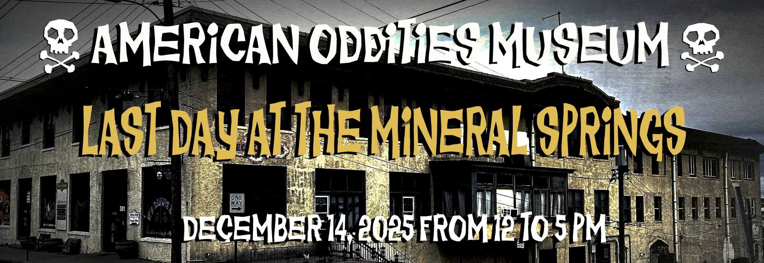 Join the American Oddities Museum for our final day before the big move! This is a PRIVATE event with a limited number of tickets sold that will include a last visit to the Mineral Springs space, a FREE book bag for all attendees, a book signing, a special sale, and a presentation on AMERICA’S HAUNTED HOTELS at 3:00 PM, which will include the history and hauntings of the Mineral Springs!